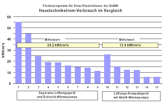 Erfolgversprechend ist vor allem eine solche Variante, bei der die Erschließungskosten einer Wärmequelle (Erdsonde, Erdabsorber) für die Wärmepumpe entfallen. Dies gelingt bei Einsatz einer Abluftwärmepumpe, die die Restenergie der Abluft nach der passiven Wärmerückgewinnung nutzt. Wird ein Erdreichwärmeüberträger im Winter zum Vorwärmen der Frischluft eingesetzt, so reicht beim Baustandard des Passivhauses die sensible und latente (Kondensationsenergie der Luftfeuchte) Wärme der Abluft aus, um zusammen mit der elektrischen Antriebsenergie der Wärmepumpe den größten Teil des Restwärmebedarfs zu decken. Die Gebäude in Büchenau und Neuenburg demonstrieren den Einsatz dieser Technologie. Wird der Wärmeschutzstandard eines Passivhauses nicht erreicht, muß eine Zusatzwärmequelle für die Wärmepumpe herangezogen werden. Das Fraunhofer ISE arbeitet seit einiger Zeit an der Untersuchung entsprechender Versorgungskonzepte für Solar- Passivhäuser und hat dafür neue Simulationsmodelle entwickelt, ökonomische Studien angestellt und meßtechnische Untersuchungen durchgeführt, um die Industrie bei der Entwicklung von entsprechenden Geräten zu unterstützen. Mit finanzieller Unterstützung interessierter Industrieunternehmen entstand ein Teststand zur Untersuchung von "Lüftungs- Kompaktgeräten" auf dem bereits einige Geräte intensiv getestet werden konnten.