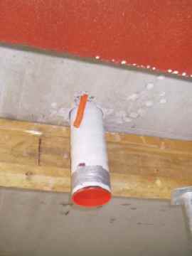 | Die Folge, sind längere Leitungswege und Kreuzungen von verschiedenen Leitungen, wenn ein Ausweichen nicht möglich oder sinnvoll ist. | Im Technikraum wurden die Kernbohrungen für den Erluftwärmetauscher (EWT) und weitere Ver- und Entsorgungsleitungen gebohrt. |