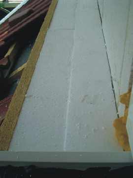 | Zudem wurde die Anschlussdämmung zwischen Unterdach und Dachoberhaut bereits angebracht. 16 cm Styropor und eine 2 cm dicke OSB-Platte bilden die Auflage für die Blendbleche, die nun von der Fa. Münzing&Habersam nun angebracht werden kann. Leider wurde vergessen, das Leerrohr für die Photovoltaikanlage und den Solarkollektor gleich nach außen zu führen, wobei dies ein Versäumnis der Bauleitung darstellt und nicht dem Zimmermann angelastet werden kann. Fraglich ist für uns nun nur, wie das Leerrohr das sauber abgedichtete Dach durchstoßen wird. | |