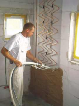 | Der Marmorit Rotkalkgrundputz wird mit der Putzmaschine aufgetragen |