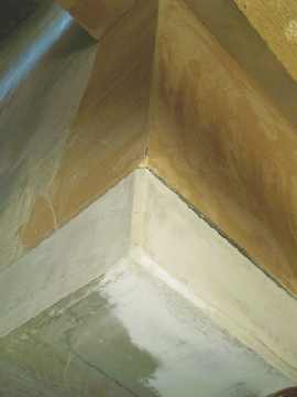 Zudem werden die sichtbaren Kanten der Betondecken einheitlich aufgefüttert, um ein ansehnliches Bild zu erhalten. Wie man sieht wäre es einfacher gewesen, die Kanten zu verputzen. Wir wollen jedoch nicht nur die Technik und Tragkonstruktionen sichtbar erhalten, sondern auch Detail wie Betondecken und Kanten. Die Betondecke bildet optisch die Trennlinie zwischen EG und OG |
