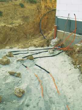 Alle Leitungen liegen in Sand. Das Sandbett unter dem Kupferrohr ist 15 cm dick, die Überdeckung ca. 10 cm. |