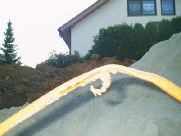 Am 22.08.2003 begann Fa. Nick aus Leonberg mit der Verlegung der kunststoffummantelten Kupferleitungen für unseren Erdkollektor, welcher künftig als Wärmequelle für unsere direktverdampfende Wärmepumpe dienen wird. |