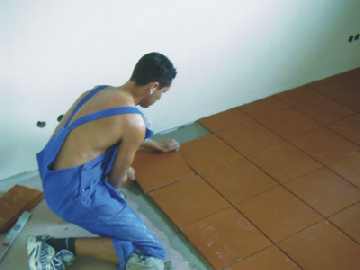 Am Dienstag wurde auch das Schlafzimmer im Erdgeschoss mit Cotto ausgelegt. Die Spaltklinker-Cottofliesen werden zuerst von unten satt mit Kleber bestrichen und dann in das Kleberbett auf dem Boden gelegt. |