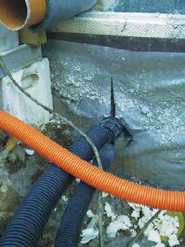 Lange haben wir darauf gewartet, endlich ist es geschehen. Die EnBW legt uns das Stromkabel ins Haus. Links der Anschlussgraben, die Mauerdurchführung rechts. Das Stromkabel ist im Leerrohr an das Haus gelegt worden. Die EnBW kam mit eigenem Bagger - eigentlich hätte man das Leerrohr zusammen mit dem Wasser ans Haus legen können, hätte man mitgedacht. Nur wer ist "man". |