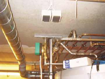 Alle elektronischen Bauteile der Haustechnik werden über die EIB-Aktoren gesteuert. An der Decke über dem Speicher sind die Anschlüsse für die Zirkulations- und Solarpumpe betriebsbereit. |