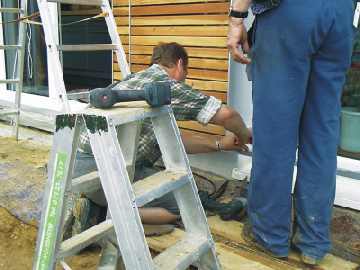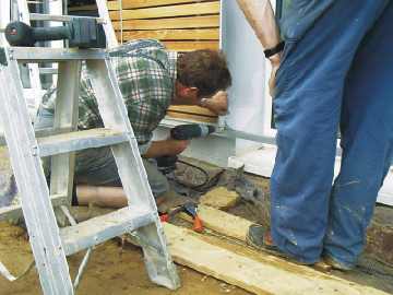 Herr Werner (rechts) weist in die Besonderheiten der Montage ein. Die Steuerung von acht Läden über drei Fenster mit sehr schmalen Parkstreifen für die Läden erforderte eine gründliche Planung. Besonders erschwert haben wir Fa. Werner die Planung durch die nachträgliche Verwendung der Lichtkeile an den Fenstern, durch die an jeder Wandscheibe 30 cm verloren gingen. |