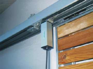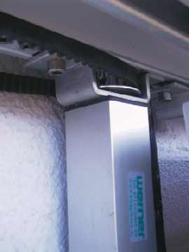 | Die zwei rechten Fenster müssen mit jeweils 3 Schiebeläden a 77.5 cm abgedeckt werden (zudem hat jeder Laden 3 cm Überstand). | Ebenfalls Platz auf der Schiene benötigen die Umlenkrollen für die Zahnriemen. Vor jedem Motor oder jeder Rolle wird ein Stopelement montiert, das den Motor per Wiederstand abschaltet. Die Abschaltung erfolgt mittels eines Gauch Power Scharniers im Schaltschrank (s.u.). | Wenn kein Platz für einen liegenden Motor an der Schiene ist, muss ein hängender Motor montiert werden. Dieser benötigt ca. 8 cm Platz auf der Schiene. | |
