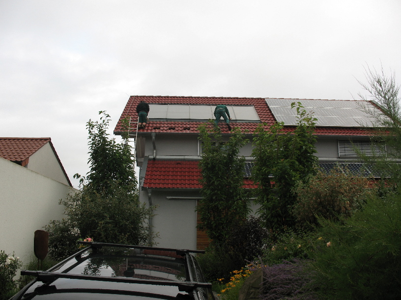 | Frühling 2009: Der Garten in voller Blüte | Im September besuchte uns Fa. Sonnenkraft und brachte proaktiv eine Zusatzhalterung an den Sonnenkraft Solarkollektoren an. |