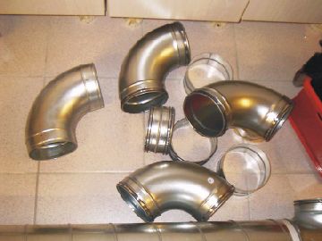 Wir haben drei weitere Lindab-Bögen 90 Grad (rechts mit Lippendichtung) beschafft, welche statt den Billigbögen, die uns der Flaschner eingebaut hat (links), im Technikraum verarbeitet werden. Damit wird die Luftführung revisionierbar. Im Klartext: nach zwei Jahren Betrieb wollen wir die Rohre innen reinigen, was mit bestehendem vernietetem Material nicht geht. |