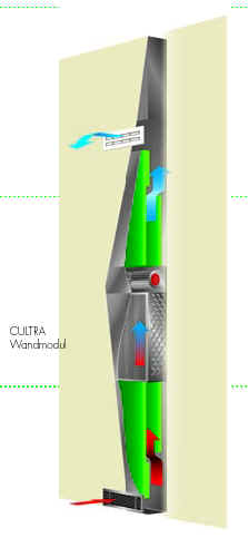 | Klimamodul CULTRA Die überlegene Art der dezentralen Klimatisierung    | In die Wand integriertes Klimamodul CULTRA verhindert die Platzverschwendung teurer Büroflächen. Diese höchste architektonische Flexibilität erlaubt eine absolut freie Raumnutzung. Bei Raumnutzungsänderung oder Umbau der Trockenwände wird ein schnelles Versetzen des Klimamoduls möglich. Der Nutzer kann sogar bei einem Umzug das Klimamodul wie eine Büroeinrichtung mitnehmen. Steckerfertiges Raumklimamodul ermöglicht eine kostensparende und eindeutig zu kalkulierende Installation. Auf den Leichtständerbau angepasste Abmessungen ermöglichen einen schnellen Einbau. Optionale Ausstattung des Klimamoduls als glattes Wandelement oder mit Büroausstattung (Whiteboard, Terminplaner, Medienwand) oder als Raumakustikmodul mit wählbarem Design. Geringe Einbautiefe von 125 mm ermöglicht den Einbau in Wände, Decken oder Boden. Ein nachträglicher Vorwandeinbau ist ebenfalls möglich. Das Klimamodul mit den Funktionen Kühlen und Heizen kann die konventionelle Heizungsanlage sowie teure Kühldeckentechnik ersetzen. Die sensible Kühlleistung mit 900 W ist auf Bürofl ächen bis 24 m² optimiert. Bei größeren Räumen können mehrere Module eingesetzt werden. Das Luftvolumen beträgt 250m³ pro Stunde. Das Frischluftzusatzmodul CULTRA FRESH für bis zu drei Raumklimamodule kann im Bedarfsfall die Grundlüftung abdecken. Da bis zu drei Klimamodule über ein Frischluftzusatzmodul versorgt werden, sind weniger Fassadendurchbrüche notwendig. Schneller Filterwechsel durch das einfach zu demontierende Ansauggitter möglich. Schalltechnisch entkoppelte Abhängung verhindert die Körperschallübertragung zur Decke und zur Ständerwand. Eine Vielzahl von Zu- und Abluftgittern ermöglicht eine große Gestaltungsfreiheit. Das schalltechnisch optimierte Raumklimamodul ist bisherigen Systemen überlegen und ermöglicht sogar den Einsatz in Tonstudios. | Über das Luftansauggitter wird Raumluft vom Ventilator angesaugt, und über den hintergebauten Filter gereinigt. Der integrierte Umlenkschalldämpfer reduziert das Strömungsrauschen. Die Luft wird dann durch das Kühl- oderHeizregister geleitet und temperiert. Zur Geräuschreduzierung ist erneut ein Umlenkschalldämpfer nachgelagert. Über das Zuluftgitter wird die temperierte Luft dann wieder in den Raum eingeblasen. Das Klimamodul kann sowohl mit Umluft, Frischluft oder Umluft und Frischluft betrieben werden.