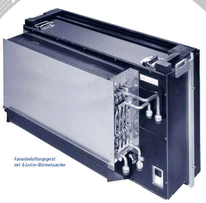 |  | Herstellerspalte - Achtung alle Angaben reine Herstellerangaben Die kombinierten Zu- und Abluftgeräte werden im Brüstungsbereich oder im Zwischenboden montiert und die Außenluft wird durch die Fassade angesaugt. Die im Filter gereinigte Luft wird mittels Zuluftventilator durch einen rekuperativen Wärmerückgewinner und einen nachgeschalteten Wärmetauscher, mit dem die Luft je nach Bedarf geheizt oder gekühlt wird, in den Raum eingebracht. Ein Gebläse saugt die Abluft aus dem Raum ab und befördert sie durch den Wärmerückgewinner und die Fassade nach außen. |