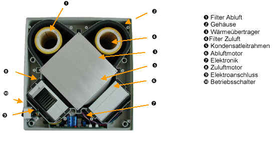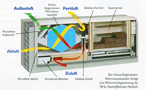 Heizsystem. Der Kreuz-Gegenstrom-Wärmeaustauscher sorgt dafür, dass die Wärmeenergie der Abluft optimal ausgenutzt werden kann.