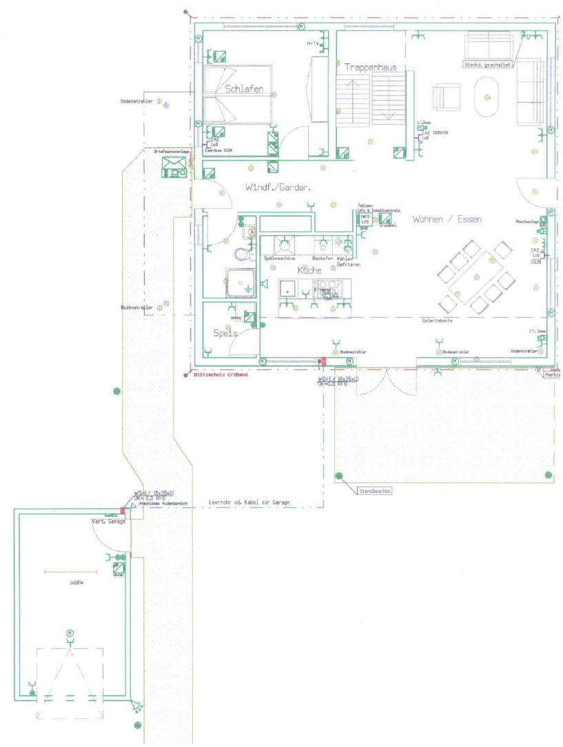 Die Türsprechfunktion ist mit der Telefonanlage koppelbar. Beachtet werden soll im untenstehenden Angebot, dass an alles gedacht wurde. So enthält das Angebot die Satellitenanlage, die Telefonanlage, die Verkabelung der Garage und der Außenanlagen, also viele Positionen, die leicht vergessen werden. Ebenfalls soll Beachtung finden, dass bereits zahlreiche Lampen (Bodenlampen, Strahler, Niedervoltsysteme) mit eingeplant wurden, die ich bisher in anderen Angeboten (nicht für unser Haus) nie fand. EIB-Verkabelung des Erdgeschosses, der Garage und der Außenanlagen. Erstellt von Elektro Schnell, Neuenstein