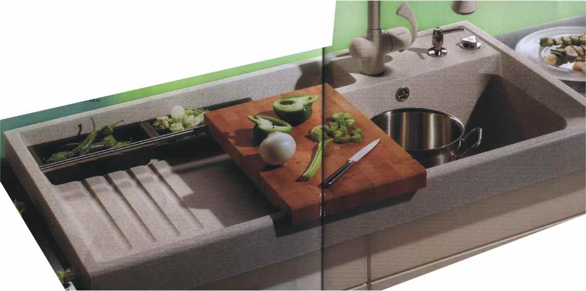 Die Breite der Arbeitsplatte wird durch die Breite des Spültisches bestimmt